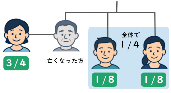 兄弟姉妹が複数いる場合は、その4分の1を人数に応じて均等に分けます。ただし、父母の一方のみが同じ「半血兄弟姉妹」が含まれる場合、その相続分は全血兄弟姉妹の2分の1となり、取り分に差が生じます。また、兄弟姉妹がすでに亡くなっている場合でも、その兄弟姉妹に子(甥・姪)がいれば「代襲相続」として相続人になります。ただし、甥・姪の子は代襲しません。
